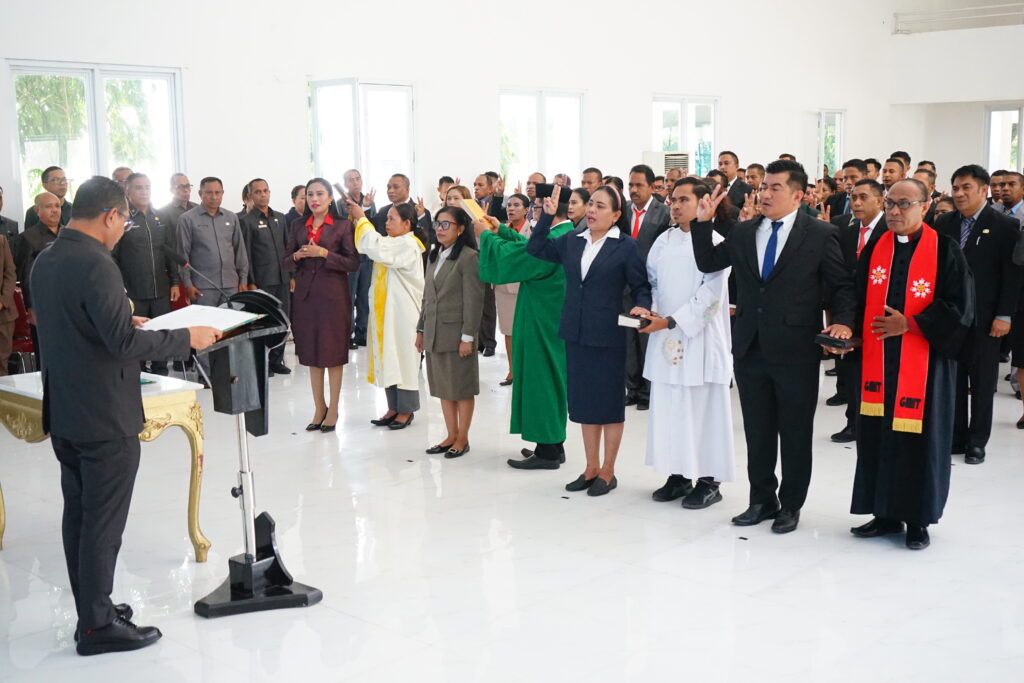 Atambua,- Wakil Bupati Belu, Vicente Hornai Gonsalves, ST mengambil sumpah dan melantik Pejabat Administrator dan Pejabat Pengawas dalam sebuah prosesi pelantikan di lingkungan Pemerintah Kabupaten Belu, bertempat di Gedung Wanita Betelelalenok Atambua, Jumat (24/4/2026).