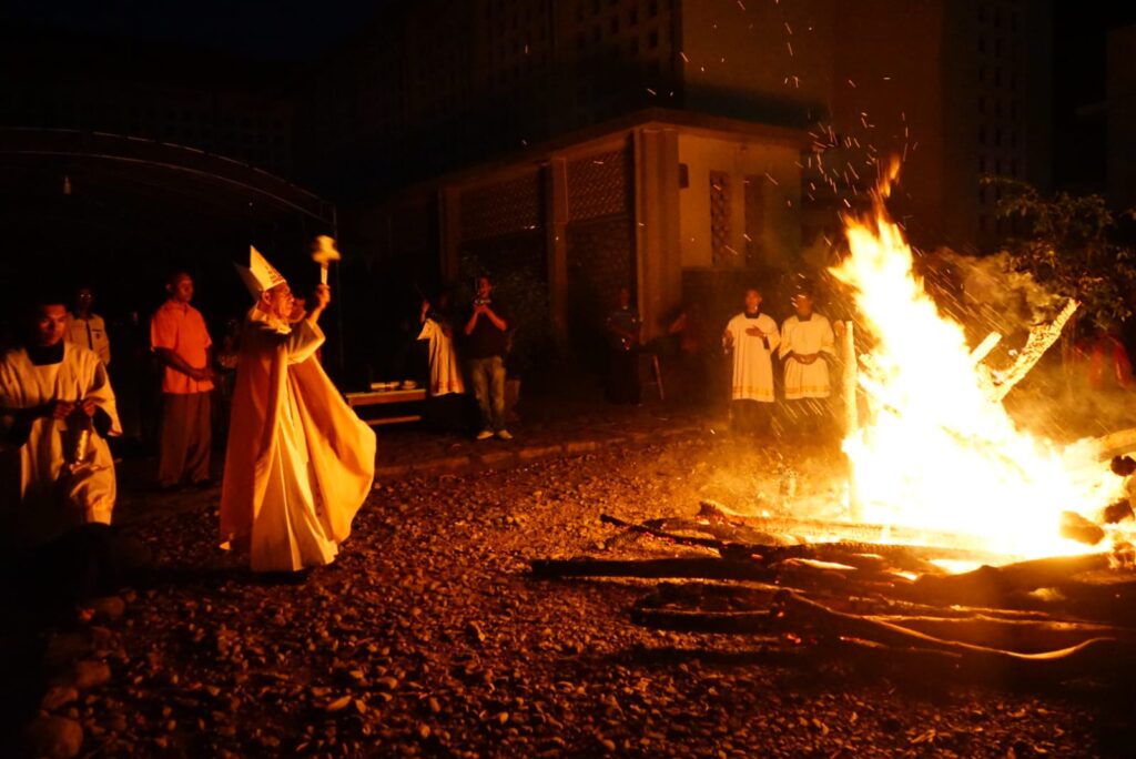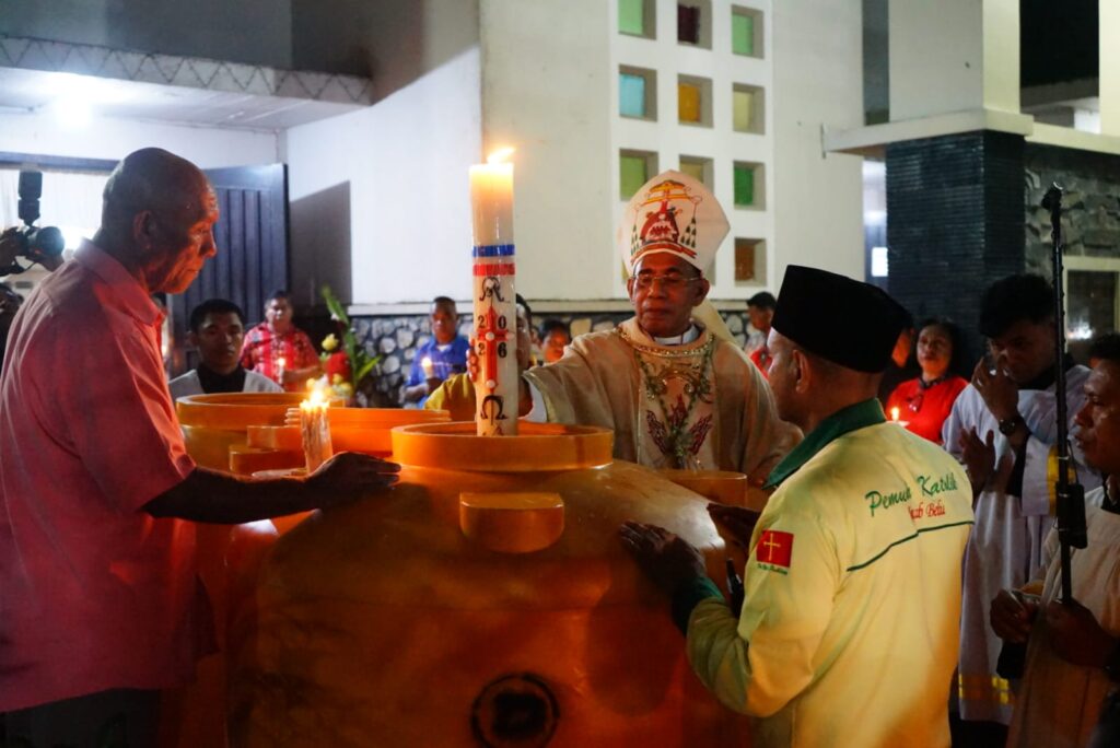 “Kita mulai dengan kisah perjalanan dari kegelapan menuju terang. Cahaya lilin yang kita pegang adalah lambang iman, dimulai dari satu lilin sebagai simbol Kristus, kemudian diteruskan hingga kita semua mengambil bagian dalam api kehidupan,” ujar Uskup Dominikus.